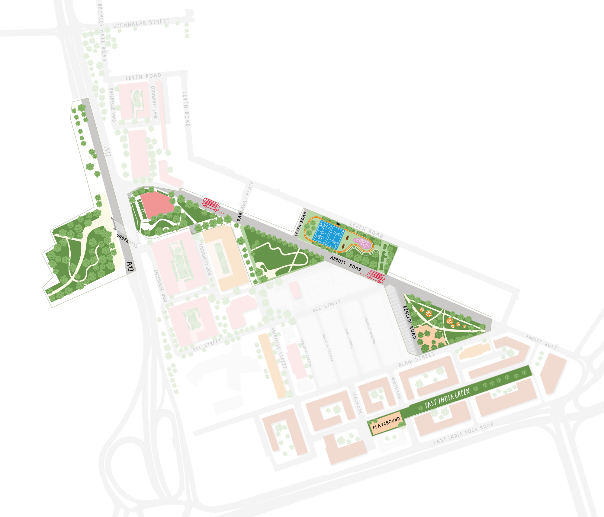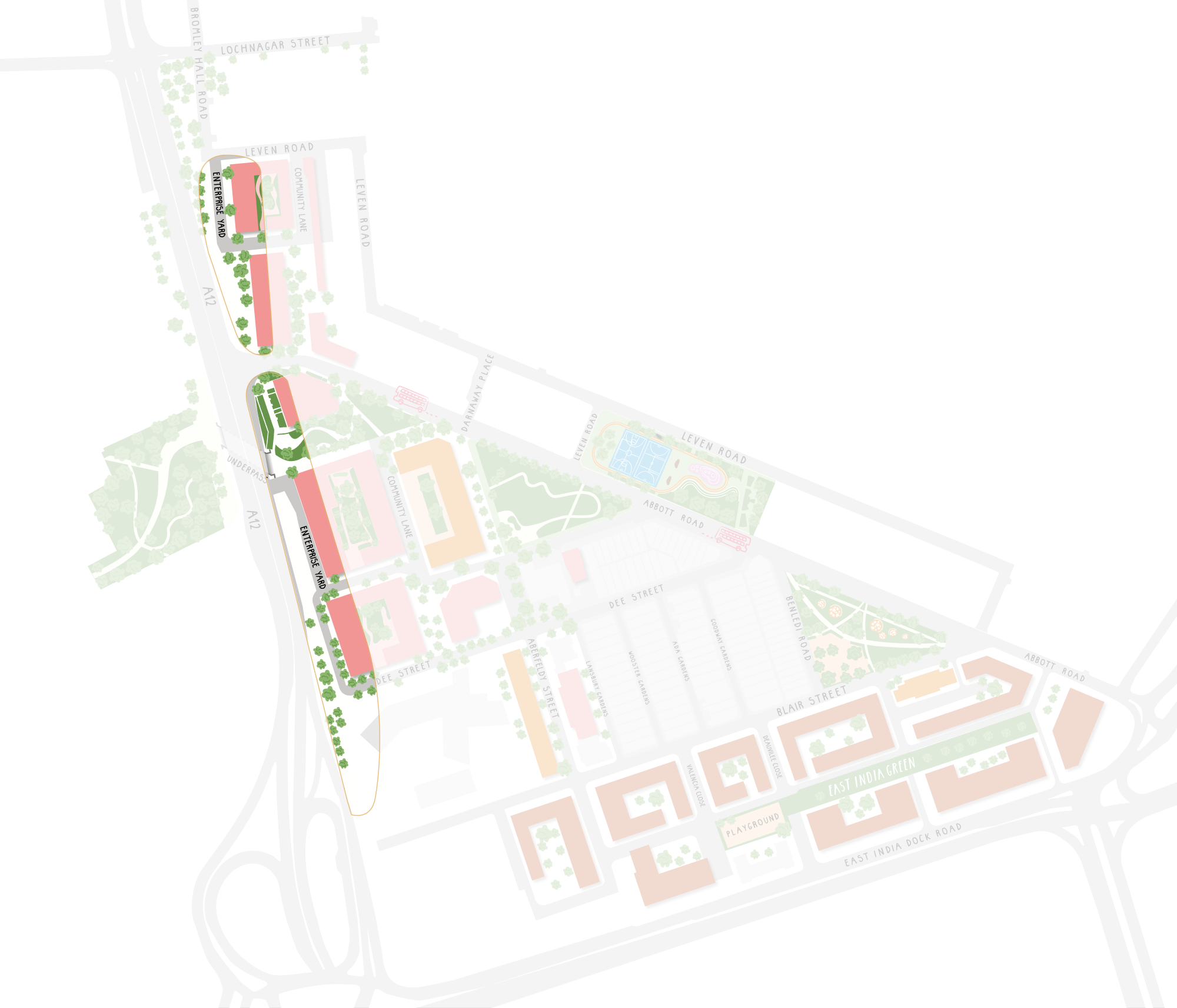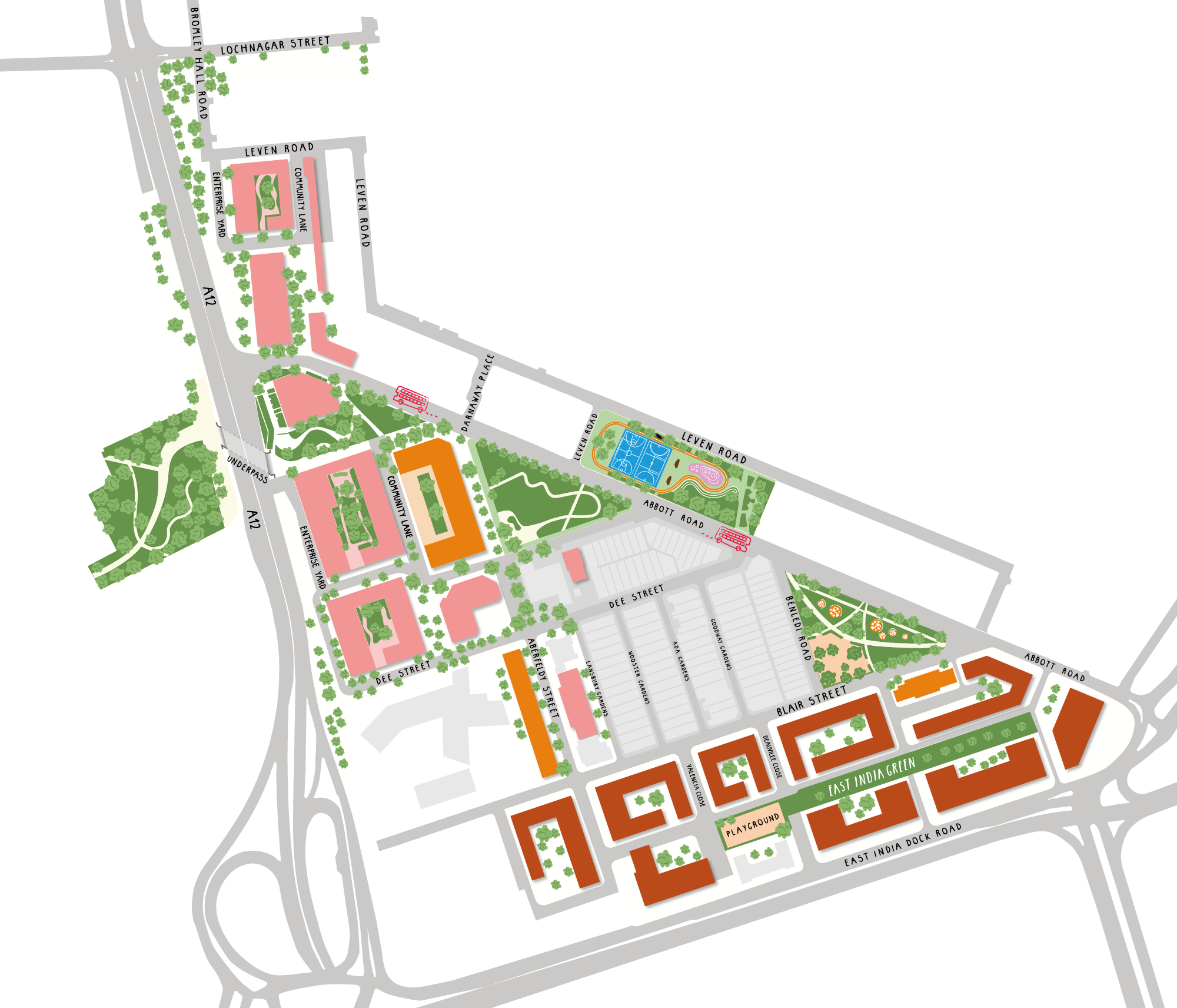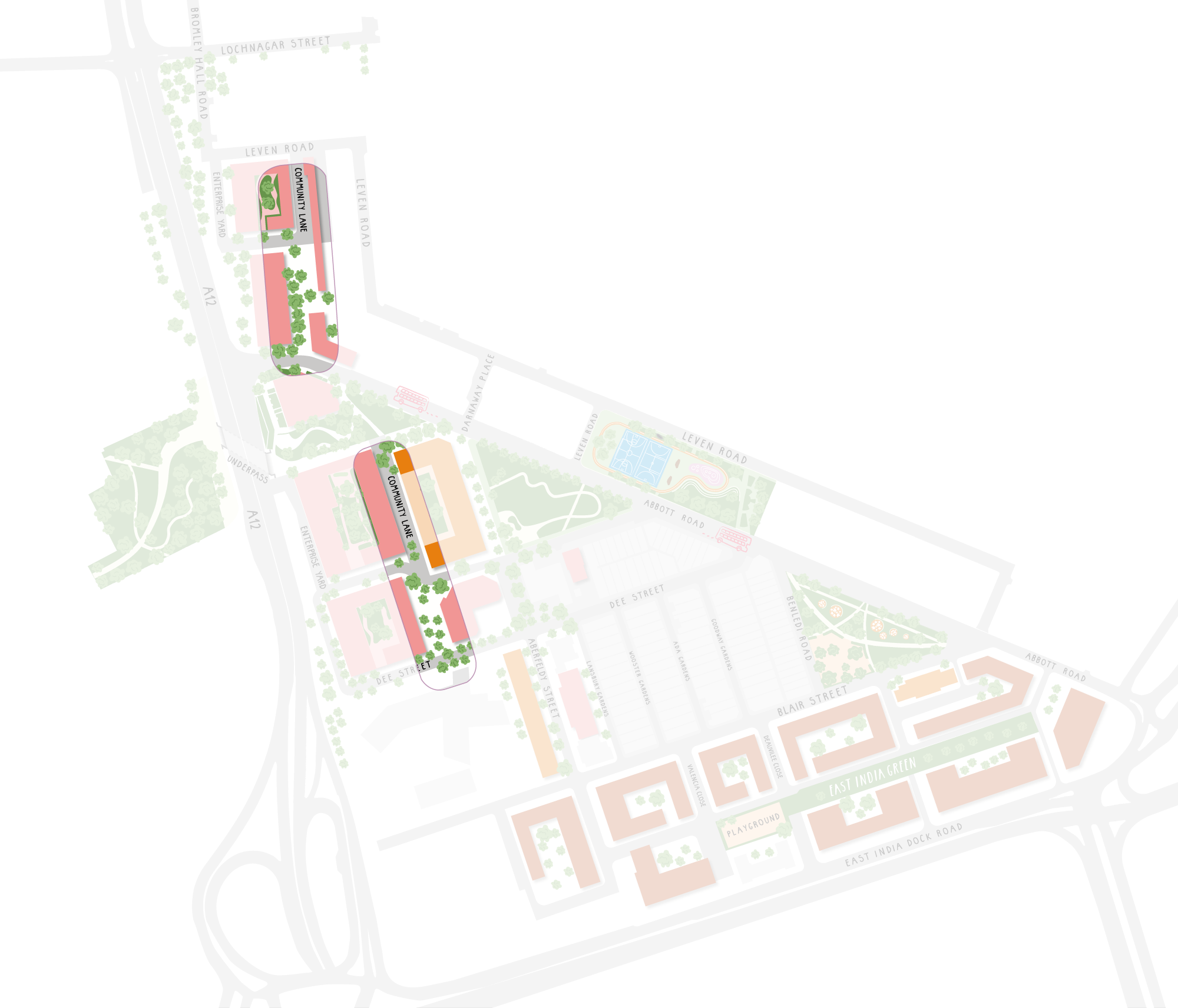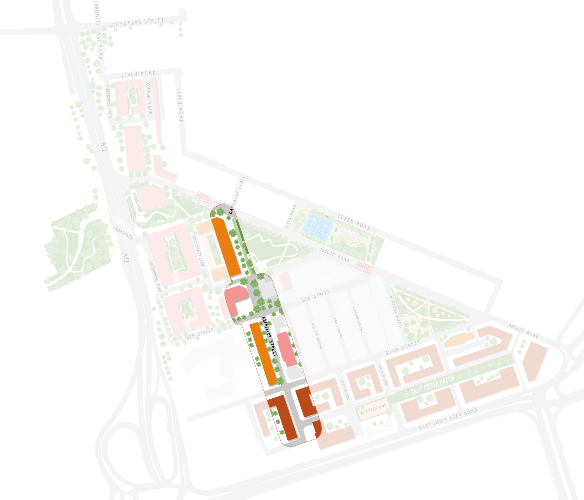 Aberfeldy Street is already a pillar of the local community and the renewed Aberfeldy Street will bring a new wave of activity and energy. Acting as the commercial and community hub of Oxbow, with local shops and independent cafés, bars and communal spaces, this is where friends, family and community will come together.